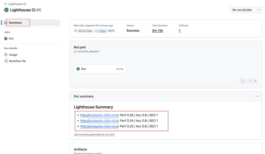 - Run の Summary に スコア一覧(Perf/Acc/SEO) を自動出力